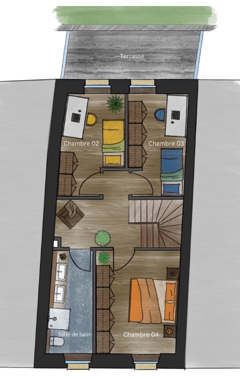 A l’extérieur vous trouverez un petit jardin avec accès sur les parkings.